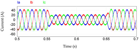 For the input of the hybrid three-phase rectifier, a dynamic behavior was observed, as shown in Figure 19. It is noted that in this analysis, when the 0.55 s period begins, the current decreases in amplitude and the control system acts causing that in approximately 0.57 s the current becomes stable, then a period of 0.65 s arrives in which 100% is activated, it is observed that the current increases smoothly until it reaches the nominal current value in approximately 0.675 s. It was also found that the load variation affected Rectifier 1 and Rectifier 2 in equal proportion.