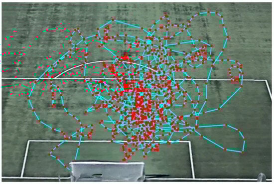 In team sports, there are two approaches when carrying out a tactical study: an individual approach, based on the movements of each player according to his position (role), and a collective approach that takes into account other more general behaviors such as interline or intraline relations. Therefore, the first problem to be solved would be the determination of the individual role of each player within the team based on spatio-temporal data. Considering Bialkowski’s definition in [], the player’s role or position on the field is understood as a space or area that is the responsibility of each player within the team. These roles, in many sports, such as basketball or football, generally have names assigned to them (center back, midfielder, striker, etc.), although sometimes there is a certain disparity in the face of small strategic, geographical, or cultural variations for the same position (for example, in this context, midfielder, interior, or winger could be considered synonyms). From the individual roles, it would be possible to derive the tactical disposition of the team, for example, if a 1-4-3-3 or 1-4-2-3-1 formation is used. Taking into account only the spatio-temporal variables, we can say that the position of each player at a given instant in time will be given by his spatial coordinates: xt = (xi, yi). Thus, knowing the successive coordinates of the player throughout a match or training session would allow us to easily represent her trajectory and, therefore, her movements, as shown in Figure 1. This figure shows the sampling points of a player during a training exercise. Similarly, the set of positions occupied by all team members at a given time t will be represented by a set of tuples of the form xt = {(x1, y1), (x2, y2), …, (x11, y11)}t, where the subscript uniquely identifies each player.