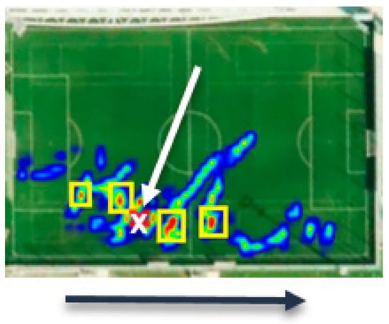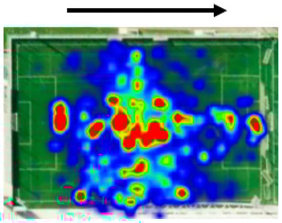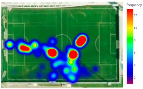Heat maps are a very useful tool when it comes to knowing the distribution of players on the field of play and can be applied at the line level (defensive, pivots, midfielders, and forwards) or at the team level, providing valuable information about field occupation and player distribution over time, as shown in Figure 13. This allows for assessing whether the team played more in one zone of the field or the other, whether they played with a high or low defensive line, and other tactical parameters (for example, in the represented case, it is observed that the team attacked more on the right flank than on the left flank).