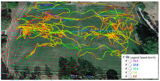 In some cases, based solely on this information, the role of each player within the team could be determined exactly. However, as observed in the previous figure (Figure 2), sometimes it is impossible to determine this role precisely due to different situations. For example, a player may switch sides during a match, occupy different positions in specific actions (corners in favor or against, direct free kicks, etc.), or enjoy freedom of movement during a match. This is easily noticeable in Figure 3, which shows a segment of the trajectories occupied by a player during a training match (in this figure, colors represent the speed range).