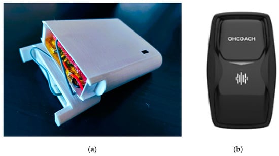 During the process of selecting the device to be built, different options were proposed. For testing purposes, we initially worked with a prototype consisting of a device made up of an Arduino nano, a GPS NEO 6M, a micro-SD card, and a power supply. Although it would be desirable to have a GPS module that could operate at 10 Hz, such as the NEO M9N, as it is considered optimal for geolocation, the NEO 6M was chosen for cost reasons. Other open hardware-based devices, like Raspberry or Maduino, were also tested. For power supply, different approaches were considered, from CR3022 button cells to power bank or Lipo batteries. Tests were carried out in different outdoor sports (football, running, cycling), with the intention of verifying that the future device could fulfill the desired requirements. The device was tested in different wearable supports (bracelets, vests, etc.), with all of them being satisfactory. Initially, we worked on collecting information on an individual basis to later extrapolate the results to the group. After building different prototypes, the selected hardware was Maduino-based. Concretely, the microcontroller was an IoT Maduino Zero A9G. This little motherboard accomplished all requirements posed. Maduino Zero A9G is an IoT (Internet of Things) solution based on the 32-bit Atmel’s SAMD21 MCU and GPRS/GSM GPS module A9G. It integrates a microcontroller ATSAMD21G18, GRRS/GSM GPS module A9G, power management, and storage. A Lipo 1800 mAh/3.7 V battery was added to the supply power, as it is capable of uninterrupted operation for more than 20 h. Although the data could be transmitted in real time using a SIM card, we chose to store it locally on each device, using a micro-SD card. Also, a case was manufactured via 3D printing to carry the set. The device shown in Figure 5a was used to collect data from grassroots soccer teams. For the professional category, data were collected using the OHCOACH Cell EPTS shown in Figure 5b [].
