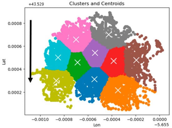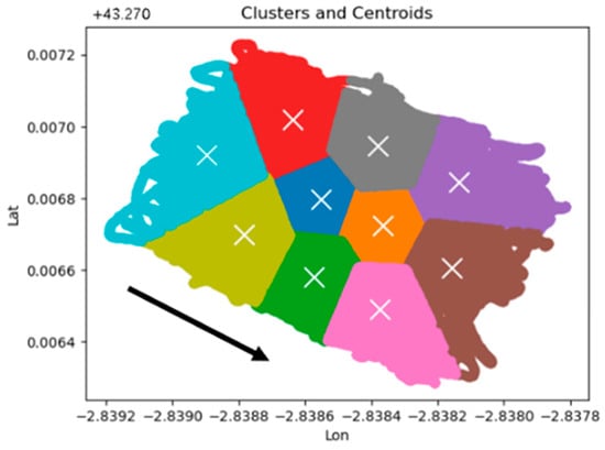 Different clustering methods have been applied to the initial dataset but have not been successful. Different methods have been tested: DBSCAN (Density-Based Spatial Clustering of Applications with Noise), GMM (Gaussian Mixture Model), and K-means. Of these, the one that has provided the best results is based on K-means. K-means is a popular clustering algorithm used to partition a dataset into a predefined number of clusters. The algorithm iteratively assigns each data point to the nearest cluster centroid and then recalculates the centroids based on the mean of the data points assigned to each cluster. This process continues until the centroids no longer change significantly or a specified number of iterations is reached. The following figure (Figure 6) shows the results after applying this method to the data of a competitive match (2nd RFEF category team). Goalkeeper data are not considered because the goalkeeper never wears EPTS devices to prevent injuries. The arrow represents the direction of attack. The following process has been followed to obtain the graph shown: starting from the spatio-temporal data collected by the EPTS, the K-means class of the Python scikit-learn library has been used to obtain the scatter plot shown, using n = 10 as the number of clusters to obtain (corresponding to the number of players on the field) and a random seed of reproducibility seed of 42.