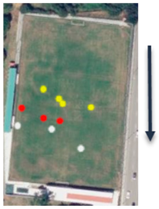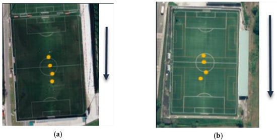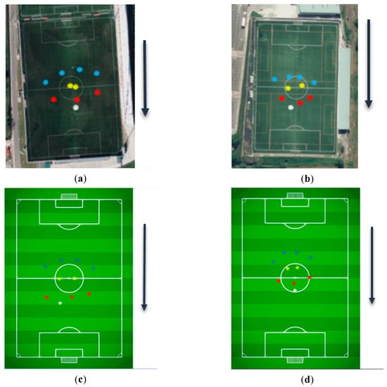 The centroids have been studied in numerous articles [,,,] as a tool with great potential for tactical analysis. The centroid of a set of geographical coordinates, as in the case at hand, identified by their longitude and latitude coordinates, will be the average point that represents the center of mass of the set. Mathematically, the centroid can be calculated by taking the average of the coordinates of all points in each dimension. To calculate the centroid of each player, starting from her individual geopositioning data, the average position of all the positions occupied during the match by that player has been calculated. Similarly, the centroid by lines and the total centroid of the team have been calculated. This approach provides a point that minimizes the sum of the squared distances to all other points in both dimensions. By calculating the centroid of each player throughout each match, said centroid will give us their mean position. Applying this method to all participating players in the match would yield the arrangement of each of them, thus allowing for the identification of each player’s role within the team and, therefore, their tactical disposition. Figure 8 shows the centroids calculated for each player over four different matches. Each point represents the calculated centroid for each player. Colors represents different lines: defenders, midfielders, and forwards. The direction of the arrow indicates the direction in which the team attacks. Note that in the two top figures, the obtained points have been projected onto real maps. However, this is not possible in all situations due to map lack of updating or displacement errors generated by GPS. In these cases, a template image has been used for clarity purposes. Although the use of a template may cause some distortion (not all fields have the same dimensions), the initial positioning of the equipment has been taken as a reference to eliminate such distortion.
