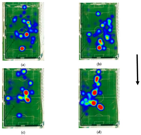 Heatmaps depending on the player’s role. (a) Defensive midfielder. (b) Support striker. (c) Center back. (d) Right back.