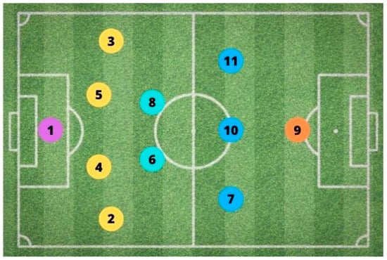 Each coordinate on the field has its corresponding representation, and the color intensity at each point reflects the magnitude of the value being represented, as shown in Figure 11. These heat maps allow for some parameterization, so that they can be adjusted to visually highlight the most frequented points by each player and analytically extract the top n points with the highest density. It could be argued that from these points (highlighted in red in Figure 11), the different roles of each player could be identified by comparison with the considered natural positions for each role. Depending on the team’s scheme, these natural positions may vary, but they are well known for each scheme, as depicted in Figure 12.