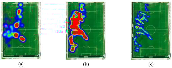 The method proposed below, unlike previous ones, is based on the use of computer vision algorithms to obtain the players’ roles from an image. There are some studies based on image analysis applied to other sports aimed at obtaining occupation maps on the field []. Based on the succession of points occupied by a player throughout the match, it is possible to generate her heat map. However, on other occasions, this map can be obtained from other monitoring methods, such as the use of tracking cameras []. A heat map is a visual representation of data where color is used to indicate the intensity or density of certain values at specific points on the map. This type of visualization is useful for highlighting spatial patterns or trends. The information is presented using colors that vary in intensity or hue, usually on a color scale ranging from cooler shades (such as blue) for low values to warmer shades (such as red) for high values.