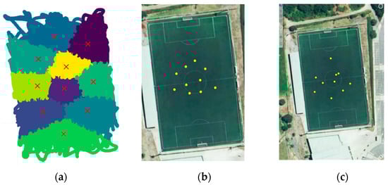 As can be seen in Figure 16c, the positions calculated for the players are closer to reality (the 1-4-2-3-1 tactical scheme showed at Figure 12) than those in Figure 16a,b. Indeed, certain anomalies can be observed in the positioning of some players (two players too close together), which allows undesired behavior to be improved in future situations. As shown in Table 6, although the sum of the differences in the distances of all players with respect to their theoretical position is quite close between the clustering-based method (115.80 m) and the proposed method (111.45 m), the standard deviation is lower by almost 2 m (6.24 m versus 4.31 m), improving the results obtained.