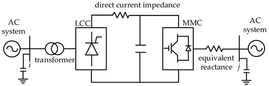 The hybrid HVDC system includes both two-terminal and multi-terminal structures. In this paper, we construct the mathematical model for the hybrid two-terminal HVDC system. Figure 1 illustrates the topology of this system, where one terminal employs an LCC converter and the other utilizes an MMC converter [36]. For simplicity, the LCC station is connected to bus i, and the MMC station is connected to bus j. The calculation models for each converter will be elaborated on in subsequent sections.