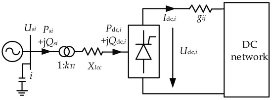 For instance, if an LCC station employs constant current control and constant transformer ratio control, (4)–(5) can be explicitly expressed as Δd4 = Idc,i − = 0 and Δd5 = kTl − = 0. Here, and are the predetermined values. The detailed control modes for the LCC station are presented in Section 2.3.