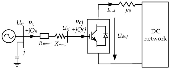 In Figure 3, Psj and Qsj represent the active and reactive power injections from the AC side at terminal bus j, respectively; Xmmc denotes the equivalent reactance of the converter; Rmmc represents the equivalent resistance, which is composed of converter losses; Usj represents the voltage magnitude at the AC side at terminal bus j; Ucj represents the voltage of the commutation bridge at the DC side; Udc,j stands for DC side voltage; and Idc,j represents the DC side current.