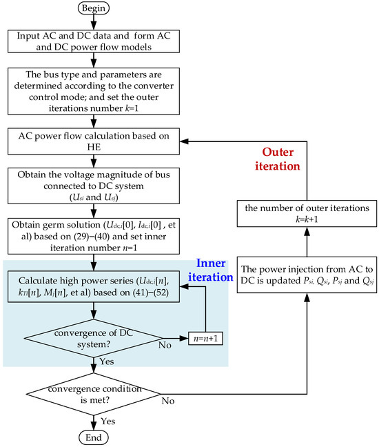 Flow chart of the sequential power flow solution method for the AC/DC system.
