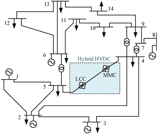 To verify the effectiveness of the proposed HE-based power flow calculation method for the hybrid HVDC system, tests are carried out using a modified IEEE 14-bus system, a modified IEEE 57-bus system, and a modified 2383-bus system. It is implemented on a laptop with an Intel Core i5-10210U with a 1.60 GHz and 2.11 GHz processor and 24 GB RAM. All original case data are from the MATPOWER toolkit [39]. The convergence criterion for the outer iteration requires that the voltage updates across all buses be less than 1 × 10−4 p.u. Similarly, the convergence criterion for the inner iteration of the DC system demands that the maximum value of the high-order power series coefficients be less than 1 × 10−4 p.u.
