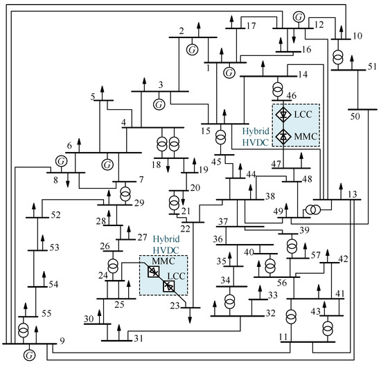 The modified IEEE 57-bus system includes two hybrid LCC-MMC HVDC lines. The diagram of the modified IEEE 57-bus system is shown in Figure 7. The converter parameters for the LCC and MMC stations are also provided in Table 2. The control mode parameters for each converter are listed in Table 3. The numbers 1–57 in Figure 7 represent the bus numbers in the modified IEEE 57-bus system.