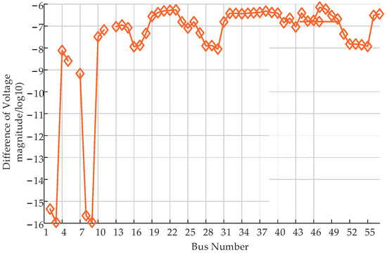 As demonstrated in Table 5 and Table 6, the AC system results and DC system results calculated using the proposed HE method are consistent with those obtained via the NR method, verifying the accuracy of the proposed method. The same accuracy results are also shown in the modified IEEE 57-bus system and modified 2383-bus system. Figure 8 shows the voltage magnitude difference between the proposed method and the NR method in the modified IEEE 57-bus system. At all buses, the voltage difference between the two methods is less than 1 × 10−6, indicating consistent accuracy between the two methods. This consistency is also evident in the modified 2383-bus system. These findings indicate that the proposed method maintains high accuracy across systems of different sizes.