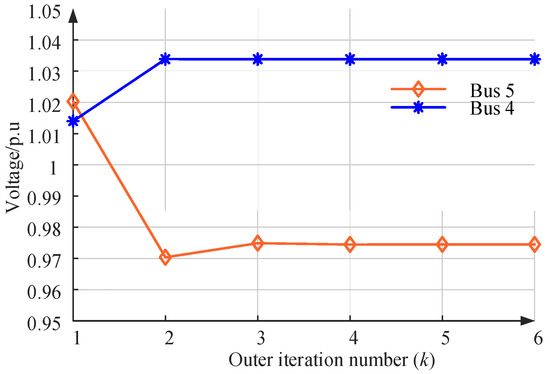 The voltage in bus 4 and bus 5 with outer iteration number k increasing in the modified IEEE 14-bus system.