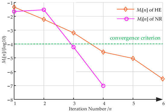 As shown in Figure 9, the voltage variables interacting between the AC system and the DC system tend to stabilize after 4 iterations, indicating that the proposed method has converged. Figure 10 displays the values of the coefficients of each order of Mj[n], calculated using both the proposed HE method and the NR method. It can be observed that as the order increases, the high-order coefficient values of Mj[n] decrease rapidly in both methods. The NR method needs three iterations to achieve converge, while the proposed HE method requires four iterations. This indicates that the proposed method can also achieve convergence quickly.