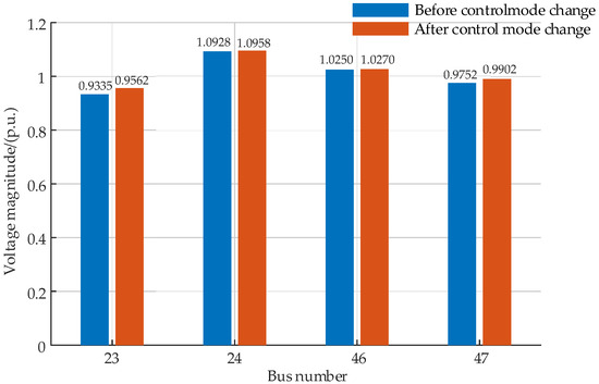 Before the control mode switch, the voltage magnitude at bus 23 is 0.9335. After switching the control mode to improve the voltage profile, the voltage magnitude increases to 0.9562, indicating an improvement in the voltage profile. Additionally, the transformer ratio of the LCC station is changed from 1 to 0.8261. The voltage magnitude before and after the control mode change is shown in Figure 11.