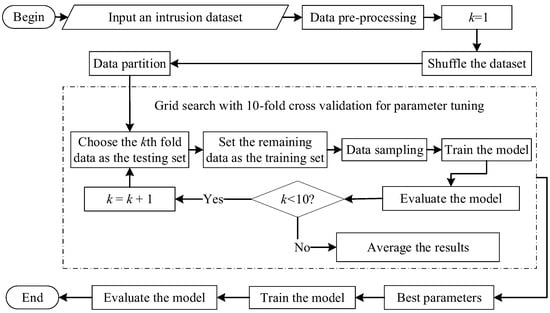 A flowchart for intrusion detection prediction using the machine learning models, namely the DT, MLP, RF, XGBoost, and CatBoost, is presented in Figure 2. As illustrated in the figure, parameter tuning incorporated a grid search with 10-fold cross-validation. Specifically, the given dataset was preprocessed. After that, the grid search with 10-fold cross-validation tuned the model parameters with the use of different sampling techniques, including the oversampling techniques (SMOTE and ADASYN) and the undersampling techniques (RandomUnderSampler and InstanceHardnessThreshold). The dataset was divided into ten subsets, with each subset used once as the validation data while the model was trained on the remaining nine subsets. This process was repeated 10 times, with each subset serving as the validation data exactly once. The average performance across all folds was then computed to evaluate the model’s performance under different hyperparameter configurations. Finally, with the best parameters obtained, the prediction model was trained and evaluated.