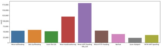 Datasets are required to train machine learning models for attack detection. Without a dataset, no training/testing of models can be carried out. In recent years, several datasets have been developed and made available by researchers, including UNSW-NB15 [] and Bot-IoT []. Specifically, the IoTID20 dataset [] was chosen for this research as this is one of the most recent datasets established in the IoT scenario for depicting realistic and up-to-date network traffic features []. A number of studies have been conducted based on this dataset for experimentation. Ullah and Mahmoud [] used this dataset. Anomalous activities in attack detection were divided into binary, category, and subcategory levels. Five machine learning models (i.e., DT, MLP, RF, XGBoost, and CatBoost) were applied to detect IoT attacks. As minority attack classes are important in cybersecurity, we focused on the detection of subcategory attacks (nine-class classification). The IoTID20 dataset, developed by Ullah and Mahmoud [], contains 86 attributes, including 3 categorical attributes. The categorical attribute is Sub_Cat. The data types in Sub_Cat data column are Mirai-Ackflooding, Mirai-Hostbruterforceg, Mirai-HTTP Flooding, Mirai-UDF Flooding, MITM ARP Spoofing, DoS-Synflooding, Scan Hostport, Scan Port OS, and Normal. The distributions of nine data types of Sub_Cat are presented in Figure 3.