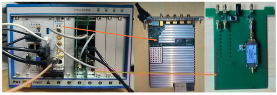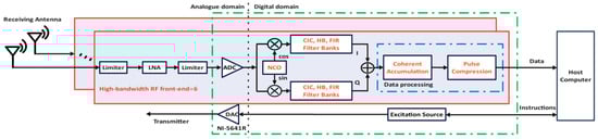 The hardware platform of the digital receiver is primarily based on the NI 5641R digital transceiver (Austin, TX, USA) (mainly including AD6654 from Analog Devices (Wilmington, MA, USA) and Virtex-5 series FPGA from Xilinx (San Jose, CA, USA)), with an ADC sampling rate of 120 MHz and a bandwidth of 46.08 MHz. The RF receiving front-end utilizes a PE15A1012 low noise amplifier (with a 40 dB gain and a signal amplification range of 10 MHz~1 GHz) and a two-stage limiter circuit composed of BAV99 switch diodes. The host computer uses a PXIe-3881 embedded host.