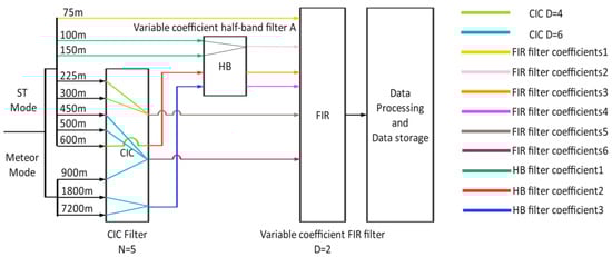 The key reconfigurable extraction filter bank uses a cascaded extraction filter link design consisting of variable parameter integral comb (CIC) filters, half-band (HB) filters, and compensated FIR filters. In order to achieve matched filtering, ideally, the bandwidth of the signal processed by the filter should exactly match the bandwidth of the transmitted signal. Assuming that the bandwidth of the original received signal is B and the original sampling rate is , when the signal is down-sampled by a factor of M, the new sampling rate becomes the following: