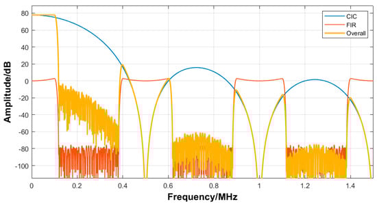 The reconfigurable filter bank uses a five-stage CIC filter design to achieve 67 dB out-of-band noise rejection, and cascaded FIR filters followed to compensate for the passband amplitude attenuation and bandwidth overshoot caused by the CIC filter. Figure 3 shows the amplitude–frequency characteristics of the reconfigurable filter bank at a 12× extraction rate and 0.1 MHz passband width (corresponding to a 900 m pulse-width echo signal).