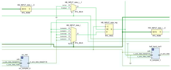 Figure 4 shows the FPGA programming RTL circuit diagram of the reconfigurable extraction filter bank. The top-level module instantiates the CIC module, half-band filter module, FIR filter module, and the corresponding config module. In the settings of the CIC module, the filter mode is set to extraction, with a cascade number of 5, and the extraction multiple can be dynamically configured through the CIC_config module. The half-band filter and FIR filter can select and switch the pre-calculated and imported filter coefficients through their respective config modules.