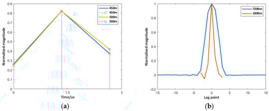 Simulation results of signal processing of radar waveforms with different parameters by reconfigurable design (integral): (a) results of 450 m and 500 m echo signals processed by reconfigurable extraction filter bank; (b) pulse compression results after extraction and filtering of 1800 m and 7200 m echo signals.