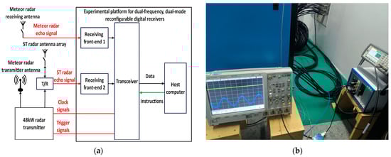 Atmospheric radio radars, such as medium frequency radars [1,2], meteor radars [3], and MST radars [4], play a significant role in the study of the dynamics and coupling of middle atmosphere and ground weather. They contribute to understanding the physics of atmospheric motion and sudden weather processes, establishing high-precision and high-resolution atmospheric models [5,6,7]. The atmospheric radio radar began to develop towards the trend of multifunctional comprehensive integration. Initially, the detection capability of the ST radar was extended to the mesosphere and the lower thermosphere by combining a meteor detection function with a narrow-beam ST radar operating at a single frequency [8,9] and subsequently by adding an ‘all-sky’ capability to an existing ST radar [10].