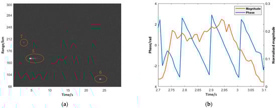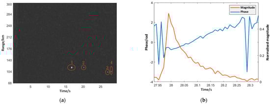 Example of a meteor detection mode echo signal (07.05 UT on 18 January 2024, pulse width 7200 m): (a) 2D distance–time plot of the radar echo signals for 30 s; (b) meteor echo amplitude and phase processing results.