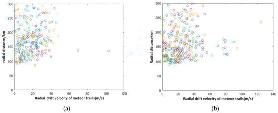 Distribution of radial distances and radial drift velocities of meteor echoes detected within one hour: (a) distance–velocity distribution of meteors in 1 h using 1800 m pulse width (from 05.00 h UT on 18 January 2024 to 06.00 h UT on 18 January 2024); (b) distance–velocity distribution of meteors in 1 h using 7200 m pulse width (from 07.00 h UT on 18 January 2024 to 08.00 h UT on 18 January 2024).