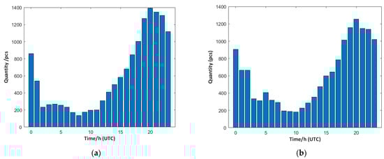 Time-dependent distribution of the number of meteors: (a) on 21 January 2024; (b) on 22 January 2024.