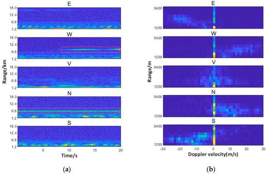 ST detection experiments were carried out using an operating frequency of 53.8 MHz and a mono-pulse excitation signal (pulse width of 600 m). Figure 12 shows the five-beam 20 s radar echoes and the power spectrums. Figure 12a shows a two-dimensional distance–time plot of the radar echoes in the altitude range of 1.2 km to 18 km for the five beams (east, west, vertical, south, and north). Significant atmospheric turbulence echoes are detected mainly from the altitude of 1.2 km to 5.4 km. Stronger aircraft clutter signals appear over the altitudes of 6 km, as shown in the frame.