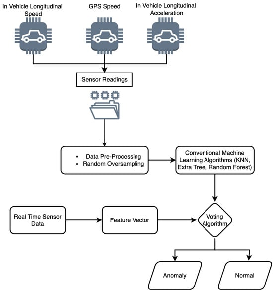 Data concerning vehicles are frequently gathered from a variety of origins, including sensors, GPS devices, and telematic systems. However, these data often need to be more complete, consistent, and accurate. Moreover, due to their voluminous and intricate nature, processing them can result in prolonged processing periods, subpar performances, and storage constraints. Data preprocessing is instrumental in enhancing the data quality by pinpointing and rectifying errors, filling in missing values, and eliminating duplicates. Additionally, it aids in reducing data size by filtering out irrelevant or redundant information, thereby enhancing the processing and storage efficiency. Our approach encompasses several data preprocessing stages: managing duplicate data, detecting outliers, normalizing linear data, and oversampling data to ensure quality. When dealing with imbalanced datasets during preprocessing, a technique called random oversampling is often employed to address this issue. This technique, employed for preprocessing imbalanced datasets in machine learning [26], entails augmenting the number of instances in the minority class by randomly duplicating some until it reaches a level comparable to the majority class. Let X denote the feature matrix and y the target vector of the original dataset. Similarly, let X_min and y_min represent the feature matrix and target vector of minority class instances, respectively. With n_major denoting the number of instances in the majority class and n_minor representing the number of instances in the minority class, random oversampling can be executed by randomly selecting k instances from X_min and adding them to X and y k times. Here, k is chosen such that n_minor + k(n_minor) equals n_major. In mathematical notation, let x_resampled and y_resampled be the resampled feature matrix and target vector, respectively. First, we calculate k as shown in Equation (2):