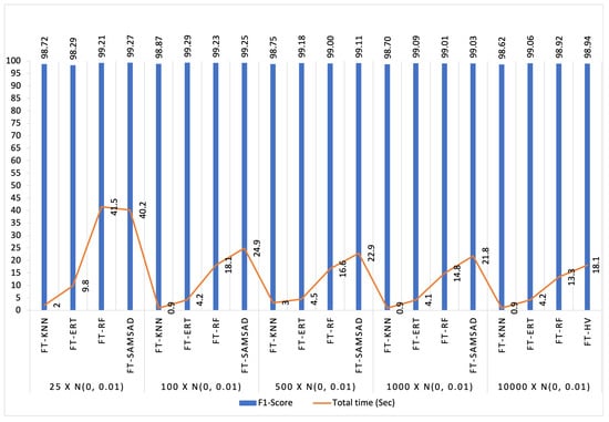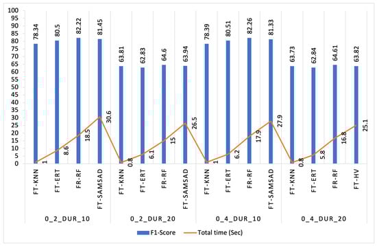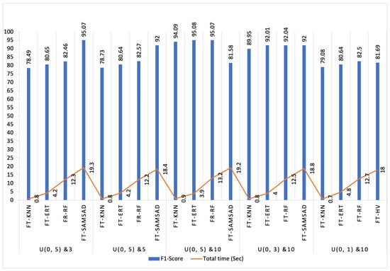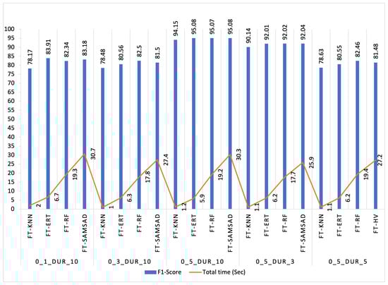 Figure 2, Figure 3, Figure 4 and Figure 5 provide the overall comparison of three models, FT-KNN, FT-ERT, and FT-RF, and FT-HV (a combination of the previous three models). All the algorithms perform well in detecting instant anomalies, with F1-Scores ranging from 98.29% to 99.27%. Figure 2 compares the F1-Scores and total time (in seconds) for different anomaly detection models applied to datasets with varying numbers of instant anomalies. FT-RF and FT-HV algorithms show the highest F1-Scores for all the magnitudes of instant anomalies, followed closely by FT-ERT. The time the algorithms take to detect instant anomalies increases with the magnitude of the anomalies. FT-KNN is the fastest algorithm for detecting anomalies for all magnitudes, taking less than 4 s for all cases. FT-ERT and FT-HV algorithms take around 4 to 25 s, while FT-RF takes the longest time, ranging from 13 to 41.5 s. In most cases, the FT-HV model has the highest F1-Score, followed closely by the FT-RF model. The FT-KNN model has the lowest F1-Score across all datasets. The FT-KNN model has the lowest run time, while the others take longer to train. However, the difference in run time between the models needs to be larger to significantly impact the choice of model, considering the high F1-Scores achieved by all models. Figure 3 compares all classifiers and the time consumption. Among the algorithms, FT-HV performs better than FT-KNN and others, as indicated by the higher F1-Scores across different dataset settings. The FT-KNN model has the lowest F1-Score across all datasets. The FT-KNN model has the lowest run time, while the others take longer to train. Figure 4 shows that the FT-RF model performs consistently well across all drift anomalies and durations, with the highest F1-Score in most cases. The FT-ERT model performs well, with high F1-Scores and relatively short total times. FT-HV, which combines the predictions of multiple models, performs similarly to individual models in most cases. The FT-KNN model has lower F1-Scores and shorter total times than the other models. Figure 5 shows that the FT-HV algorithm performs well for most anomaly types and durations, while the FT-ERT algorithm is particularly effective at detecting bias anomalies with short durations. The FT-KNN model has lower F1-Scores and shorter total times than the other models.