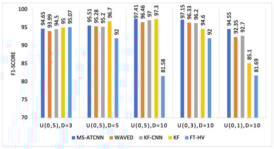(1) Instant: Table 2 presents the detection performance of instant anomaly detection using FT-HV. The first row represents the results of instant anomaly detection when the magnitude is low. In all the next rows, the magnitude of the anomaly increases. There is less danger when the magnitude is low, and there is a higher chance of danger when the magnitude is higher. For a magnitude of “25 × N(0, 0.01)”, the model achieves an accuracy of 99.27, a recall of 99.27, a precision of 99.28, an F1-Score of 99.27, and an AUC of 99.26. The training time (second(s)) is reported as , the prediction time is , and the overall time is . The table shows that as the number of anomalies increases, the accuracy, recall, precision, F1-Score, and AUC of the model decrease slightly. However, the decrease in performance is relatively small, indicating that the model can still accurately predict the labels even when the number of anomalies is high. We can also see that as the number of anomalies increases, the model’s training time and prediction time increase, which is expected as the model processes more data.