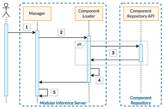 Sequence diagram illustrating the process of loading and initializing the pluggable components. (1) The administrator modifies the configuration and restarts the application. (2) The Manager checks which component needs to be loaded and calls the appropriate Component Loader to do it. (3) The Component Loader checks if the component is in the local file system. If not, it sends a request to the Component Repository to download the component. (4) If the downloaded component is a model, the Component Loader unpacks the file and uses a dedicated inferencer method to load it. Otherwise, the Component Loader decompresses and initializes the component. (5) The Manager connects the component to other elements in the pipeline. If the inference pipeline is ready, it checks whether the input/output data formats are consistent.