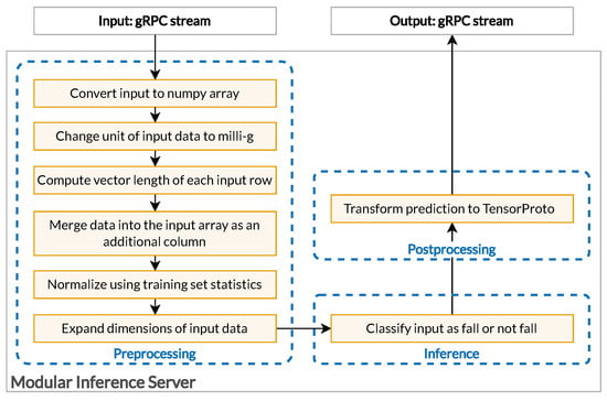 The first preprocessing step transforms the input received over gRPC into the format of a numpy [] array, which is often used for numerical operations in Python. Then, as the unit in which acceleration is measured by the tags differs from the milli-g (where g stands for the universal gravitation constant) employed by the model, it is converted in the second preprocessing step. Subsequently, a new feature is created based on the input values by calculating the length of the vector formed by the three acceleration axes supplied by the client. The result is added as a new column to the input data. Later, the obtained array is normalized with the help of statistics calculated on the training dataset to ensure that the scale of the input data follows the scale of the data the model was trained on. Afterwards, the dimension of the input data is expanded to form a batch of one input sequence for model inference. In the inference stage, the model processes the input data and assigns the probability of this input sequence being a fall in the range [0–1]. Finally, the prediction is encoded as a map of tensorflow.TensorProto and transmitted back, along with the original identifier of the message. The size of the output messages is both considerably smaller and more deterministic than in the next use case focusing on scratch detection.