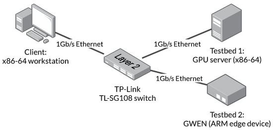 During the experiments, two different machines were used for hosting the Modular Inference Server. The first is the GWEN, the ARM64-based edge device developed as a part of the ASSIST-IoT project. The GWEN was designed to be power-efficient and thus has very limited processing capabilities. The second is an x86-64-based GPU server with ample computing resources. The detailed specifications of all machines used in the experiments can be found in Table 1. The machines were connected via Gigabit Ethernet, with a TP-Link TL-SG108 L2 switch, as illustrated in Figure 6.