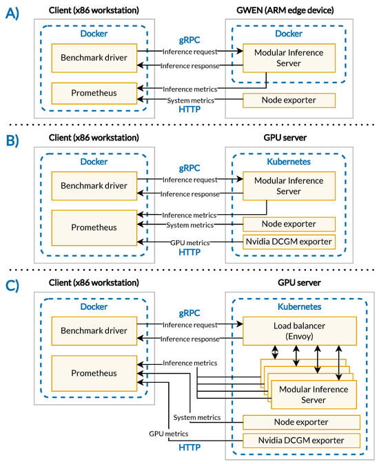 In the experiments, a total of three different deployment scenarios were considered, as summarized in Figure 7. For the GWEN edge device, due to its limited computing resources, only one instance of the MIS was deployed in Docker without a load balancer (scenario A). For the GPU server, two deployment variants were used with Kubernetes (kubeadm 1.28.2). In scenario B, one instance of the Modular Inference Server was deployed without load balancing. In scenario C, a varying number of MIS instances were deployed in Kubernetes (1, 2, and 4), with a load balancer directing gRPC requests to them. The load balancer used in the tests was Envoy 1.18.3 in a round-robin configuration.