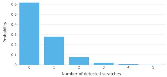 Probability distribution of the number of detected scratches per image in the evaluation dataset.
