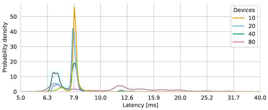 For the resource-constrained GWEN, only one deployment variant was investigated: one MIS container in Docker, and one client with a varying number of client devices, which served as the data sources. Figure 9 illustrates the request–response latency distribution, thus measuring the time from the client sending an individual request in a gRPC stream to it getting the corresponding response. The plot does not include the experiment with 160 client devices, as the MIS did not manage to process that many requests in real time, which yielded very high latencies (see Appendix A). As can be seen in the figure, for 10, 20, and 40 devices, the most common latency was around 8 ms, with some requests taking less. For 40 and 80 devices, requests taking longer appeared more often. In all presented cases, the maximum latency did not exceed 62 ms, while the median ranged from 7.52 ms (40 devices) to 11.63 ms (80 devices).