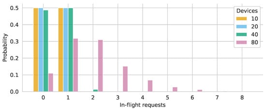 Due to the nature of the gRPC protocol, the request and response streams are not synchronous. This effectively means that the client may send several messages in the request stream before it starts getting the corresponding responses from the server. In the context of this study, an inference request that was sent but not yet responded to is called an in-flight request—it can be thought of as queued for processing. Figure 10 presents the distribution of in-flight requests for the experiments on the GWEN. The in-flight count was measured and recorded every time a request was sent and a response was received. Hence, for 10 and 20 devices, the in-flight count was only 0 or 1, which corresponds to requests being sent and received serially in a synchronous manner. For 40 devices, situations with two in-flight requests occurred, while for 80 devices, the in-flight count reached up to 10 requests (not shown on the plot due to the very small bar size).