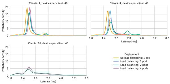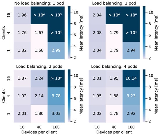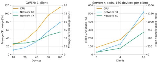 The following experiment variants were conducted. With the GWEN (setup A on Figure 7), only one client was tested, which corresponded to the real-life scenario. The one client simulated the load of 10, 20, 40, 80, or 160 devices. With the GPU server, both setup B and C were tested (without or with load balancing; see Figure 7). In setup C, the number of MIS pods was 1, 2, or 4. In all experiments with the server, the number of clients was 1, 4, or 16, and the number of devices per client was 10, 20, 40, 80, or 160.