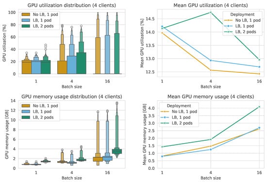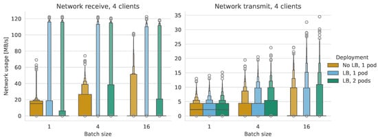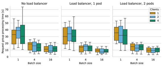 The following experiment variants were conducted. With both setup B and C (see Figure 7), the number of clients was 1, 2, or 4, while the batch size (number of images per gRPC request) was 1, 4, or 16. In setup C, the number of MIS pods was 1 or 2. In all experiments, the clients generated vehicle scans in the same manner as described above.