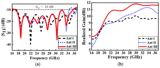 However, due to the input impedance change caused by loading the director, Ant II operates at a lower cut-off frequency at 34.6 GHz. In order to overcome the drawback for achieving a higher gain and wider bandwidth without increasing the size, a series of metallic vias has been placed in tandem on each edge of the AVA as perforation. The neighboring metallic vias have a radius of 0.3 mm and are separated by 1 mm. The simulated return loss (|S11|) for the proposed antenna is depicted in Figure 2a. After loading the metal vias, the original current path is interrupted, which can induce extra resonances and broaden the AVA’s impedance bandwidth [18]. It can also be explained that adding metallic vias on both side edges of the AVA will increase the electrical length of the antenna, leading to expending the bandwidth at a high operating frequency [19]. As seen in Figure 2a, the proposed AVA (Ant III) operates from 16.9 GHz but to a higher cut-off frequency of 35.6 GHz compared to Ant II, which means the impendence bandwidth is broadened.