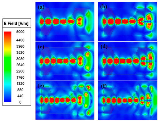 Simulated E-field distribution on surface with (b,d,f) and without (a,c,e) director at 22 GHz, 26 GHz, and 30 GHz, respectively.
