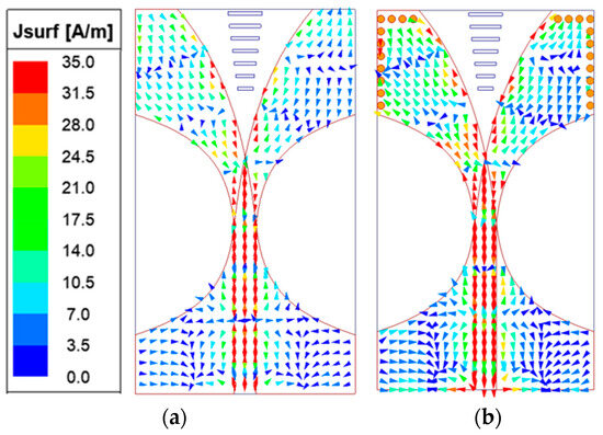 In order to analyze the characteristics of the metal through hole to improve the gain, the surface current distribution of the antenna at 26 GHz is mapped. As depicted in Figure 4, periodically loaded metallic vias perform like a perfect conductor (pec) boundary condition, forcing the electromagnetic energy to distribute majorly in the main radiation region. It can be noticed that the magnitude of the surface current vector has increased along the taper slot, which means more energy has focused in the main radiating direction as shown in Figure 4. It can be clearly seen that a significant gain enhancement within all operating bands can be achieved as shown in Figure 2b. It should also be noted that the realized gain of Ant III is increased by 1.8 dBi at the maximum, reaching 11.8 dBi at 31 GHz when operating with a wider bandwidth of 16.9–35.6 GHz as simulated.