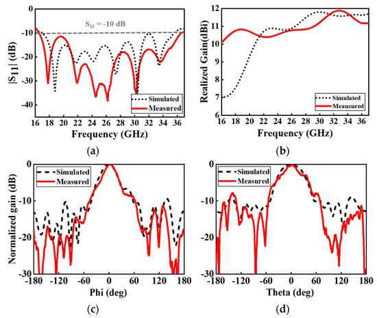 As shown in Figure 6a, the fabricated AVA achieves excellent impedance matching within 16.5–36.6 GHz, which also indicates that the operating band has slightly shifted to a lower frequency resulting from the variation of the dielectric constant of the fabricated substrate. The measured reflection coefficient is lower than −20 dB at 22–27 GHz and lower than −15 dB at 21–36 GHz. The measured and simulated radiation patterns of the proposed AVA at 26 GHz are illustrated in Figure 6c,d. As plotted, a stable radiation pattern with a narrow main lobe, low back lobe, and side lobe level both in the E-plane and H-plane at 26 GHz is obtained both in the simulated and measured plot. As for the realized gain measurement, a good agreement between the simulated and measured results is observed in the higher-frequency bands. Due to the frequency shift caused by the fabrication and test error mentioned above, the peak appearing in 23 GHz shifts to a lower frequency, which coincides with Figure 6a as it indicates that the lower cut-off frequency deviates to a lower frequency band. The measured gain is 9.8–11.9 dBi at 16.5–36.6 GHz where the peak gain reaches 11.9 dBi at 33 GHz.