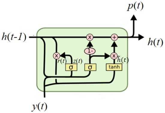 Structure of GRU. The y(t) data are input into GRU and then processed by the update gate and reset gate in GRU; finally, p(t) is output.